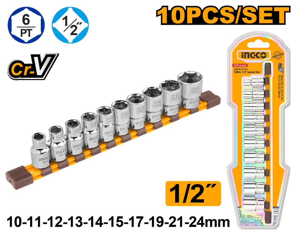 10 Pcs 1/2" socket setInclude:10 Pcs 1/2" sockets:10,11,12,13,14,15,17,19,21,24mmMaterial:50BV30 High quality Cr-V steelMirror polish finish Heat treated Chromed platedSupplied in a convenient storage rail