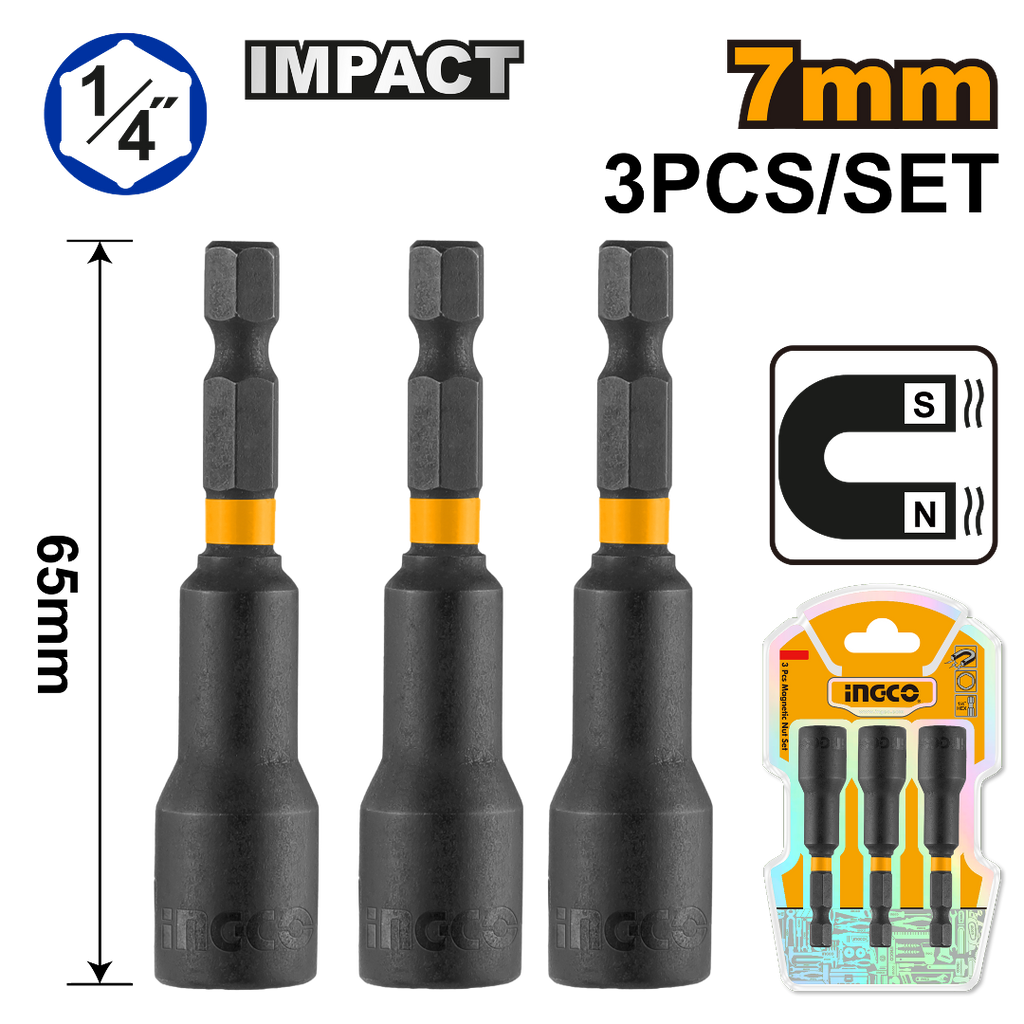 7mm,3pcs/set Shank: 1/4" Hex Length: 65mm Material: 50BV30 With strong magnetPacked by double blister