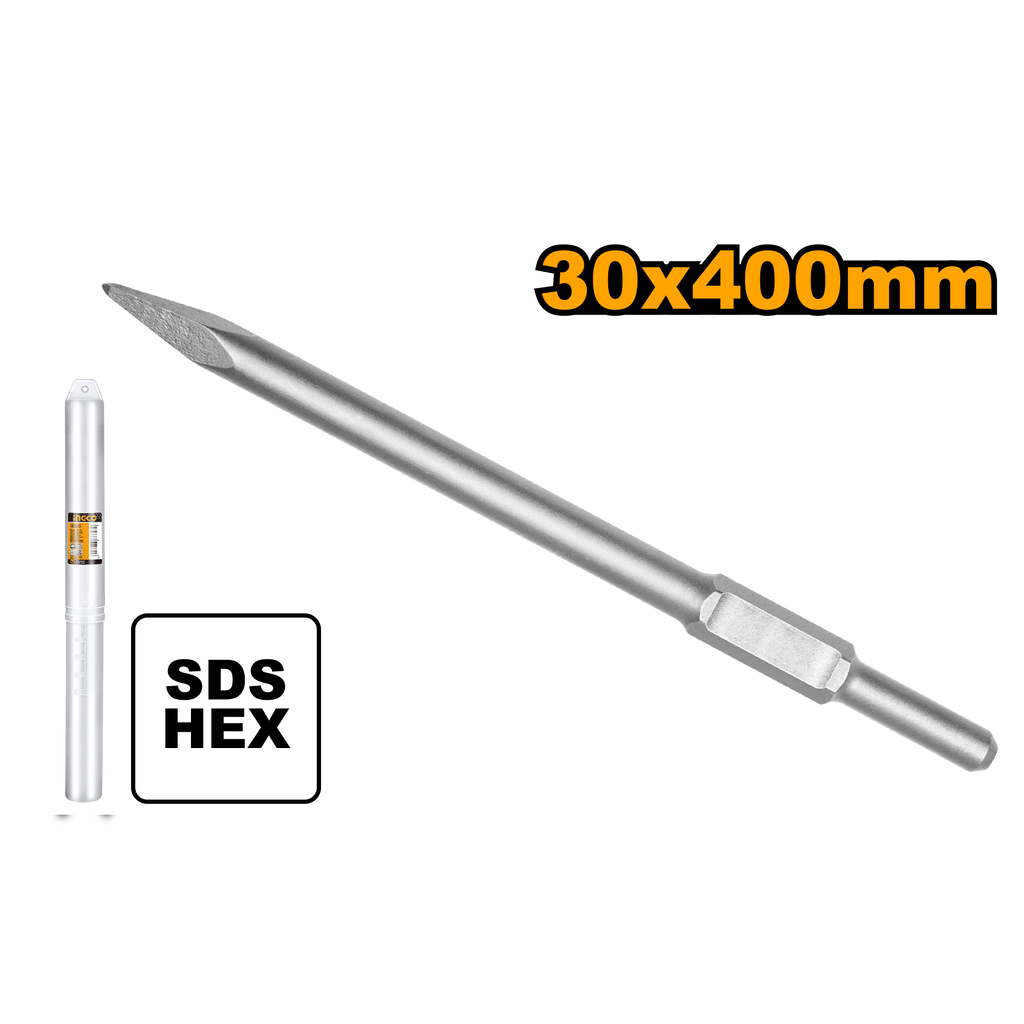 Hex chisel,30X 400mm,pointWear-resistant, high hardness and long service lifeUsed in concrete, brick wall,cementPacked by plastic tube