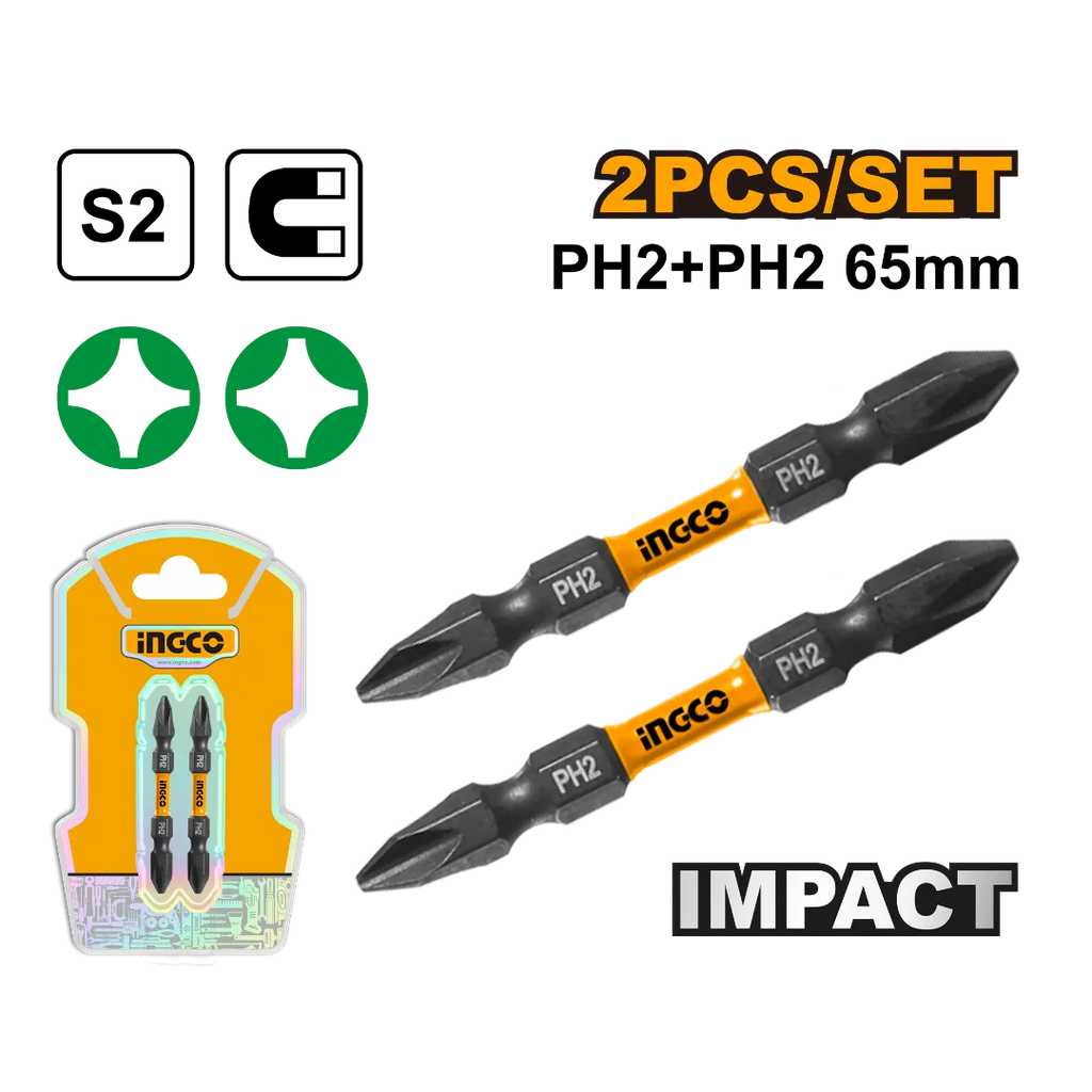 Impact Screwdriver bits PH2+PH2,65mm,2pcs/set S2 industrial steelBlack surface with magnetPacked by double blister