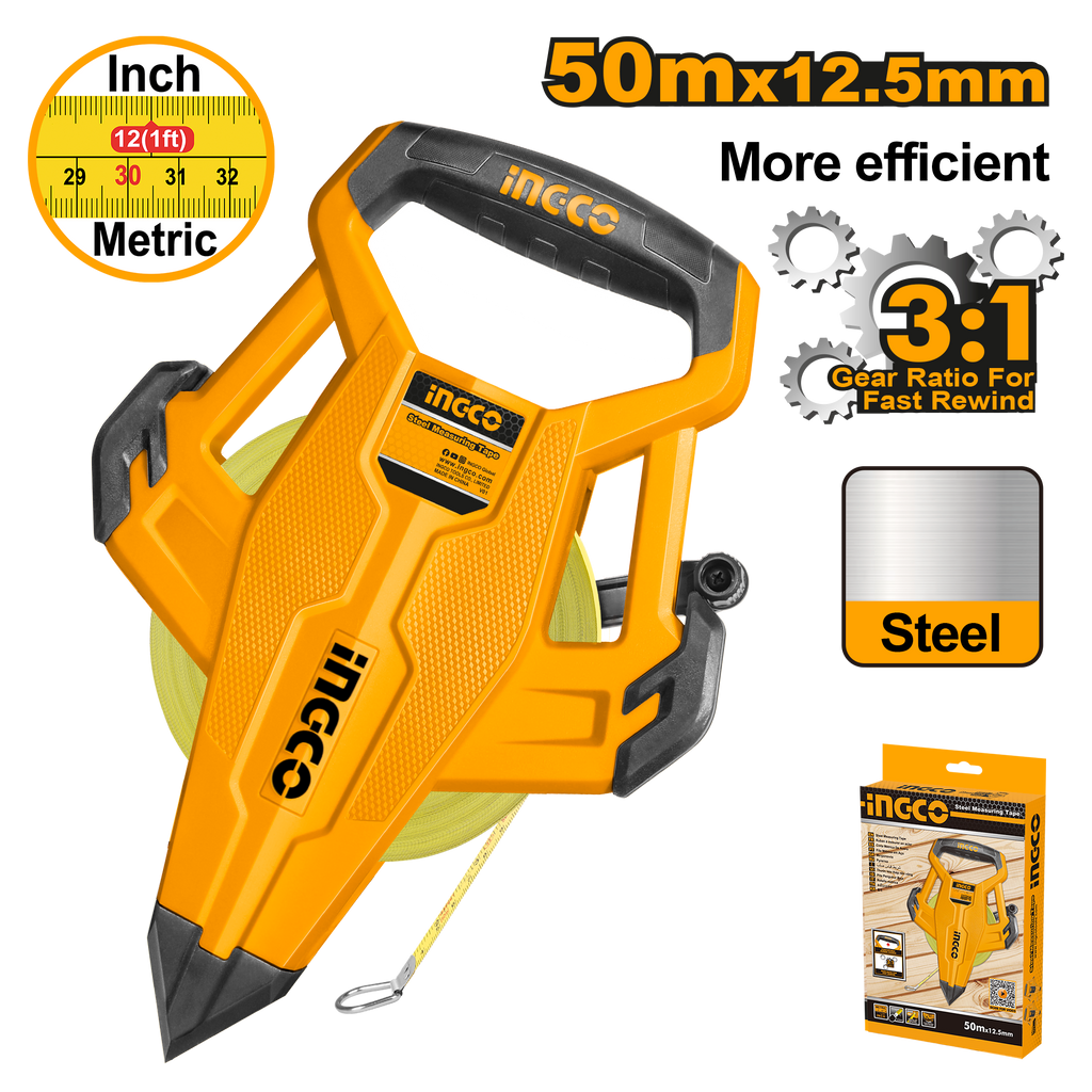 3:1 Gear ratio for fast rewind Length & width:50mx12.5mm With metric and inchPure material retracting gear With all rubber coverIntegrated handle good for using and convenient storingErgonomic handle Packed by color box