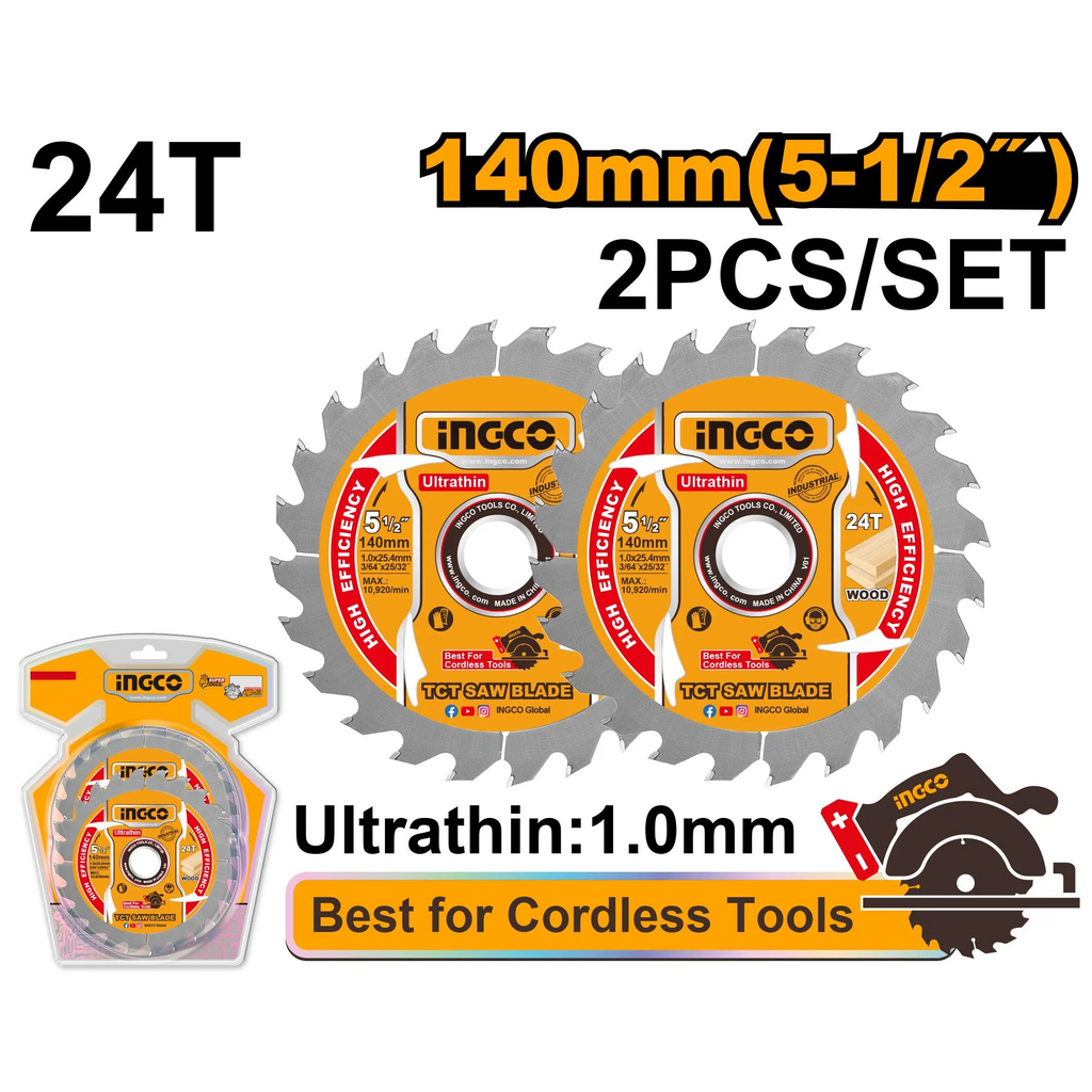 2 Pcs/setSize: 140mm(5-1/2") Teeth quantity: 24T Arbor: 20mm Reduction ring: 16mmMatrix thickness: 1.0mmBetter for Lithium-ion circular saw Suitable for lithium-ion circular saw CSLI1402Wood cuttingPacked by double blister