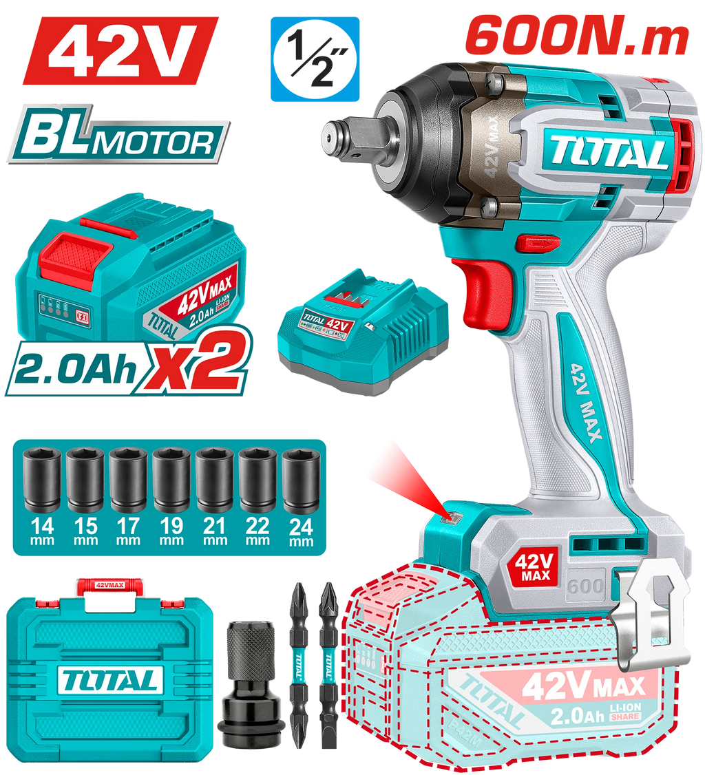 Voltage: 42V Square drive: 1/2" No-load speed: 0-1700/0-2100/0-2300rpm Impact rate: 0-2400/0-2800/0-3300bpm Fastening torque: 600Nm Nut-Busting torque: 750Nm Integrated LED work light