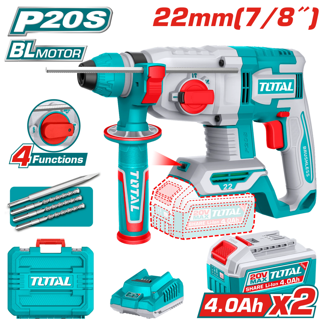 Brushless motor Voltage: 20VNo-load speed: 0-1100rpm Impact rate: 0-5400bpm Impact energy: 2.0J Max.drilling capacity: Concrete: 22mmSteel: 13mm Wood: 28mmSDS Plus chuck system