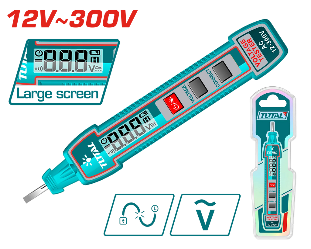 Test Voltage: AC 12-300V LCD digital displaySound and light alarm Auto power offLow-battery indicationWith 1pcs LR03 AAA battery Packed by double blister