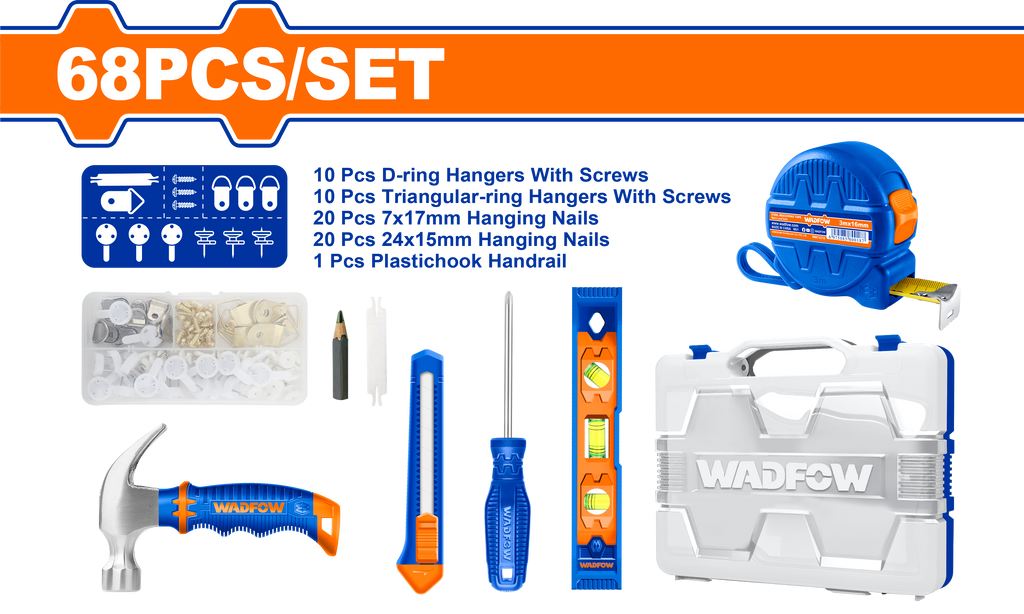 68 Pcs picture hanging tools set IncludeÔºö1 Pcs 3mx16mm steel measuring tape 1 Pcs PH1x100mm phillips screwdriver 1 Pcs 9mm snap-off blade knife1 Pcs 8oz mini claw hammer 1 Pcs mini spirit level10 Pcs D-ring hangers with screws
