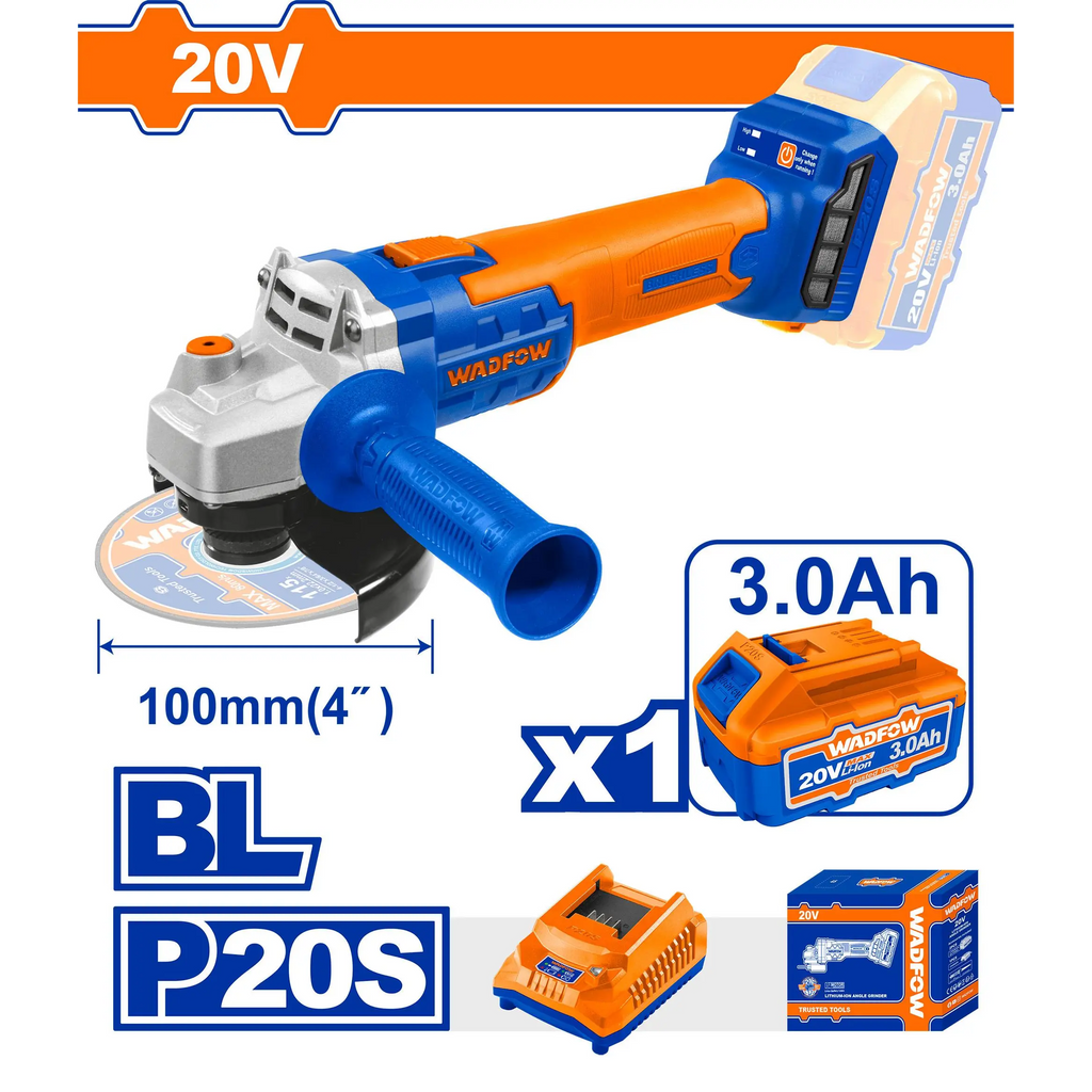 Brushless Motor Voltage:20VNo-load speed:3000/9000rpm Disc diameter:100mmSpindle thread:M10 Include:1 Pcs 3.0Ah battery pack (WLBP530)1 Pcs charger (WFCP518)
