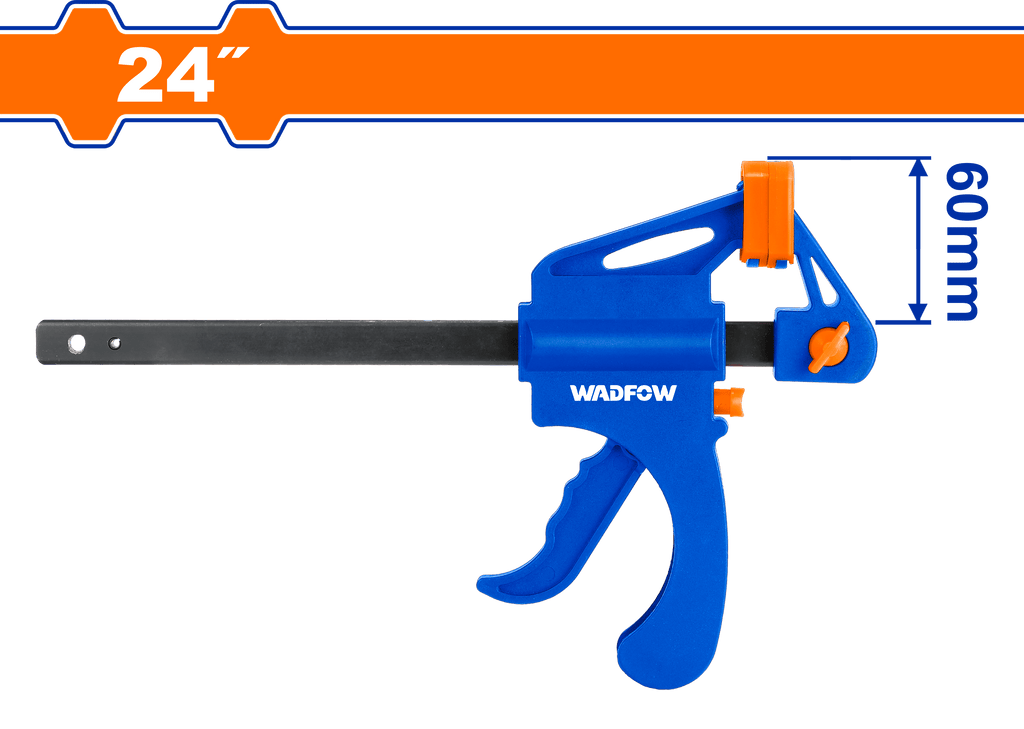 24" Clamp size:60x600mm Hard plastic body Black finished bar Soft non-marking pads Packed by label